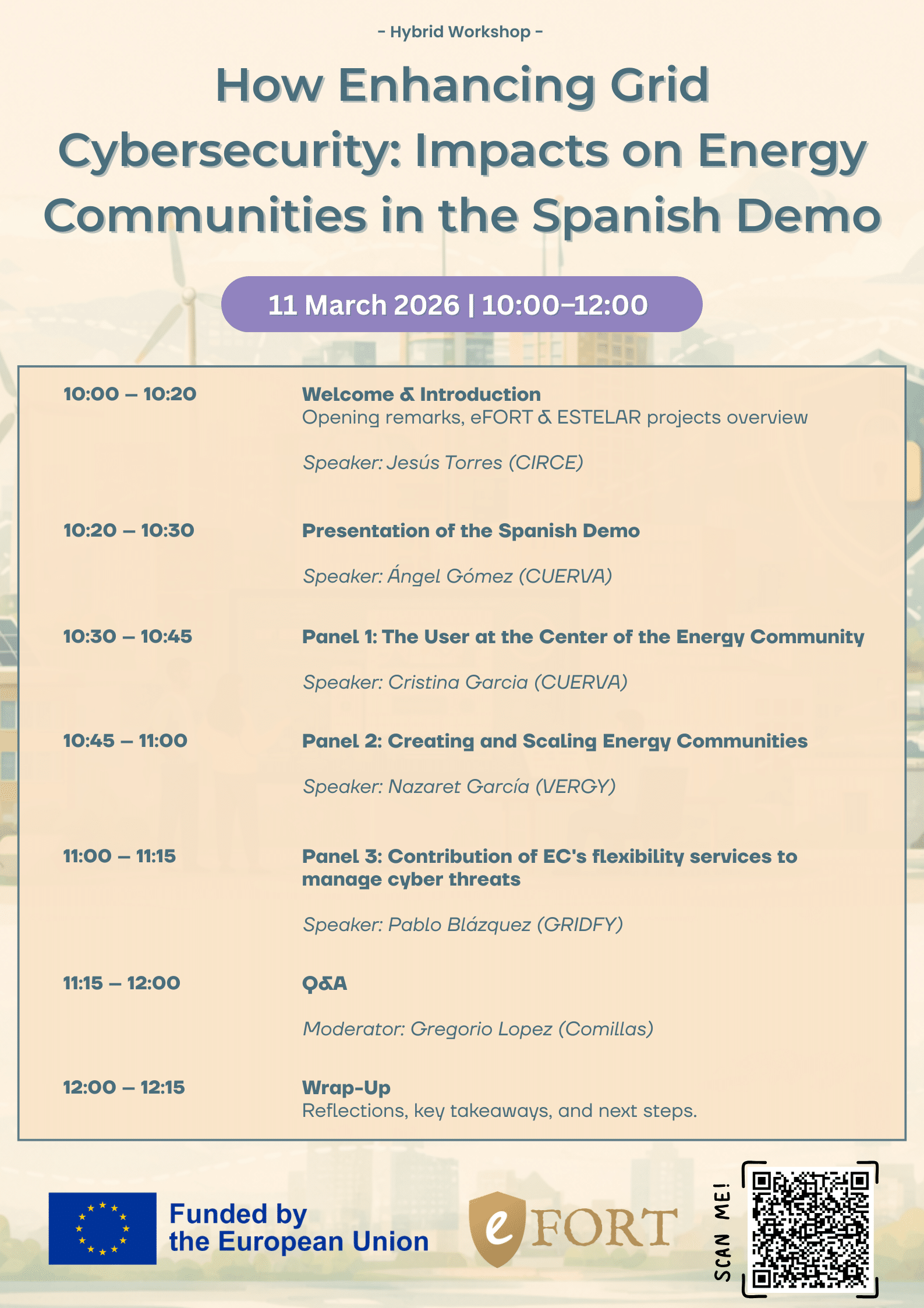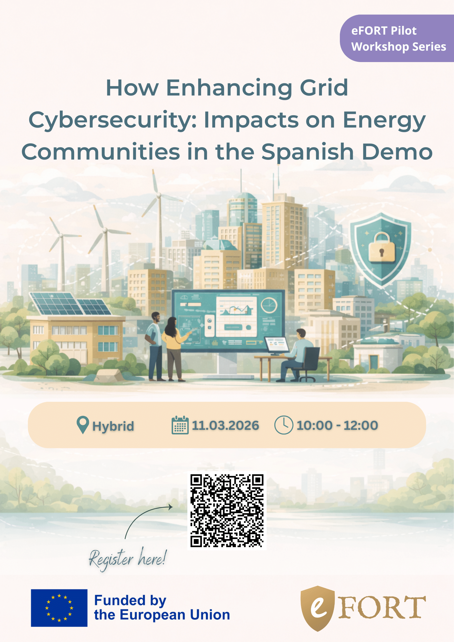 Join this hybrid workshop showcasing the Spanish demonstration of the eFORT project, a Horizon Europe initiative working to strengthen the resilience and cybersecurity of European power grids. The event will explore how secure and modernised electricity networks can build trust with users, support energy communities, and unlock flexibility services that contribute to a more resilient energy system.